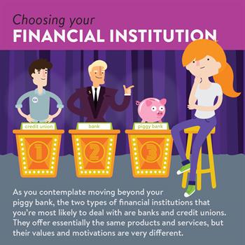 When you first made that decision, piggy banks, sock drawers and buried-in-the-sandbox-like-pirate-treasure all seemed like perfectly acceptable options. As it turns out, they aren’t nearly as super-secret as you might have hoped. Opening a bank account is the best solution, but in order to do that, you first need to choose a financial institution—so, your choice is between a bank and a credit union.