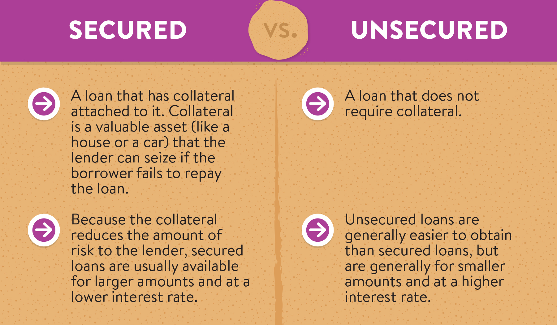 Start with brushing up on some basic loan terminology and then move on to learning about different types of loans. Secured loans, for example, are different from unsecured loans. Secured loans have collateral, like a car or house, attached to them. This collateral minimizes the risk that the creditor takes on, so your loan payment is typically less on a secured loan than an unsecured loan.